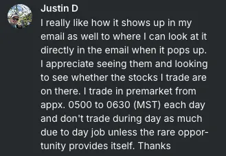 Alerts of my stock picks twice per week. You'll see when I enter, and when I exit. Plus - I'll include an analysis of my thought process.
